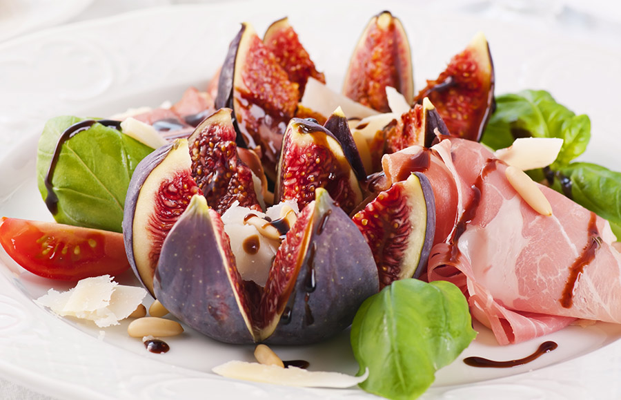 Fíky omyjeme, ogrilujeme na rozpáleném oleji a rozkrojíme „do květu“, položíme na talíř, přidáme srolovanou parmskou šunku, lístky bazalky, nakrájená rajčata, zakápneme dresinkem, který si připravíme z citrónové šťávy, medu, olivového oleje a soli. Posypeme hoblinkami parmezánu a zastříkneme balsamico glazé.