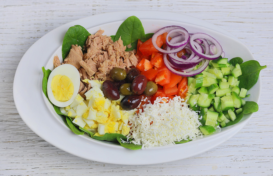 Těstoviny uvaříme v osolené vodě, scedíme, propláchneme a necháme odkapat. Těstoviny, fazolky, papriky a cibulky promícháme. Z tuňáka odlejeme olej do misky a maso roztlačíme vidličkou. Olej z tuňáka, rostlinný olej, Bzenecký vinný ocet z červeného vína, citrónovou šťávu, česnek a cukr důkladně vyšleháme. Osolte a okořeňte dle vlastní chuti. Těstoviny dáme na velký talíř spolu s nakrájenou okurkou, vajíčky, rajčaty, tuňákem a poté zalijeme zálivkou.