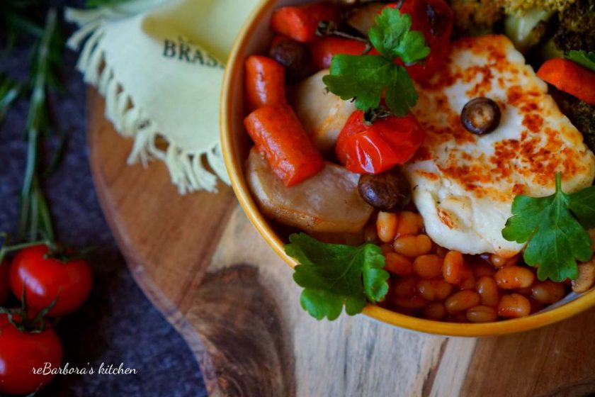 Vezměte si adekvátně velkou misku a vyskládejte do ní upečenou zeleninu. Já mám ráda, když je každý druh zvlášť, pěkně vedle sebe, ale záleží samozřejmě na vás, jak to máte rádi. Doprostřed či vedle zeleniny dejte část fazolí a nahoru položte plátek sýra halloumi. Super je vše posypat ještě nasekanou petrželkou nebo třeba koriandrem.