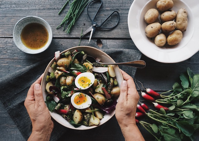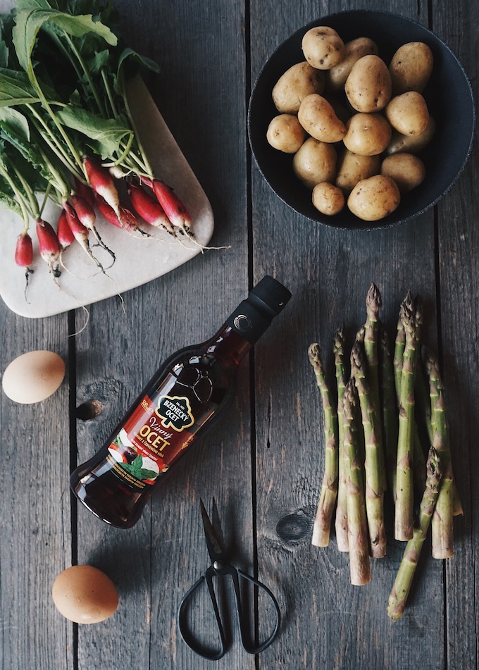 A je to tady! Chřestová sezóna začala. Musím se přiznat, že já jsem svou cestu k chřestu hledala docela dlouho. Není to tak, že by mi nechuhtnal, jen prostě přijít na to, jak ho nejlíp použít, mi prostě chvíli trvalo. Každopádně u chřestu platí zásadní pravidlo – musí být čerstvý. Když stonek ohnete, musí krásně křupnout a prasknout, ten gumový si nekupujte, nebude z něj nic dobrého. Tenhle nakyslý bramborový salát připravuju v průběhu roku v mnoha variantách, na jaře do něj přidám špenátové listy, pažitku, chřest a je z něj třeba skvělá příloha ke grilování nebo s vajíčkem rovnou lehčí hlavní jídlo.