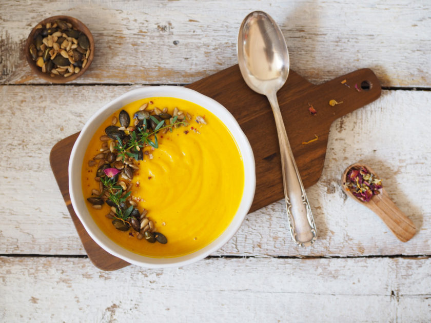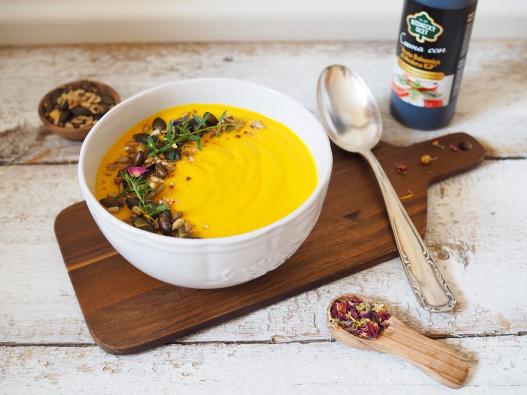 Ze všech druhů dýní asi nejvíce v kuchyni používám Hokaido. Dá se z ní připravit tento krásně jemný krém s nádechem exotiky, kterému dodává správný šmrnc pečená mrkev.