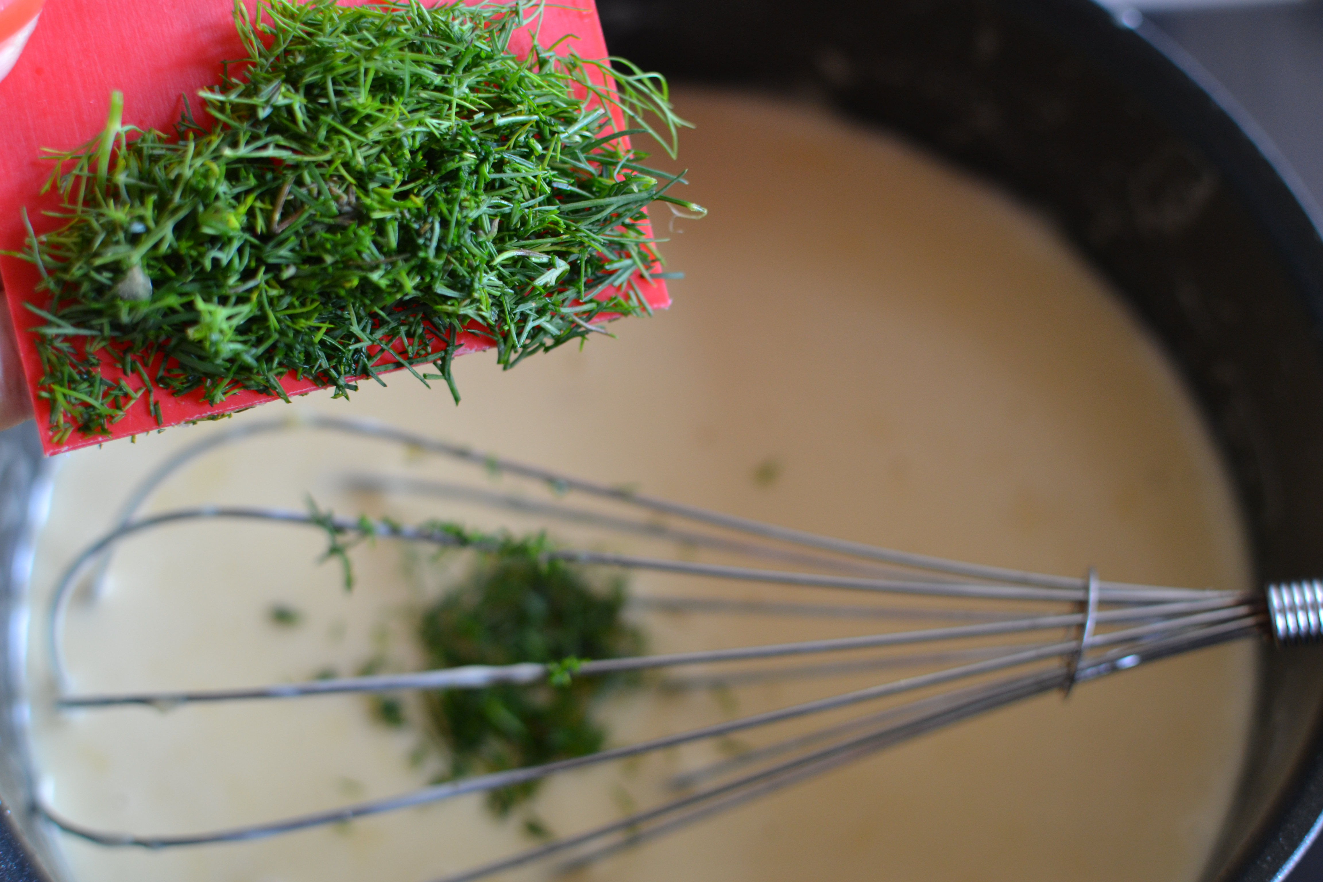 - Ihned přidáme také nadrobno nasekaný kopr. Používáme jen jemné části kopru, ne tvrdé stonky.