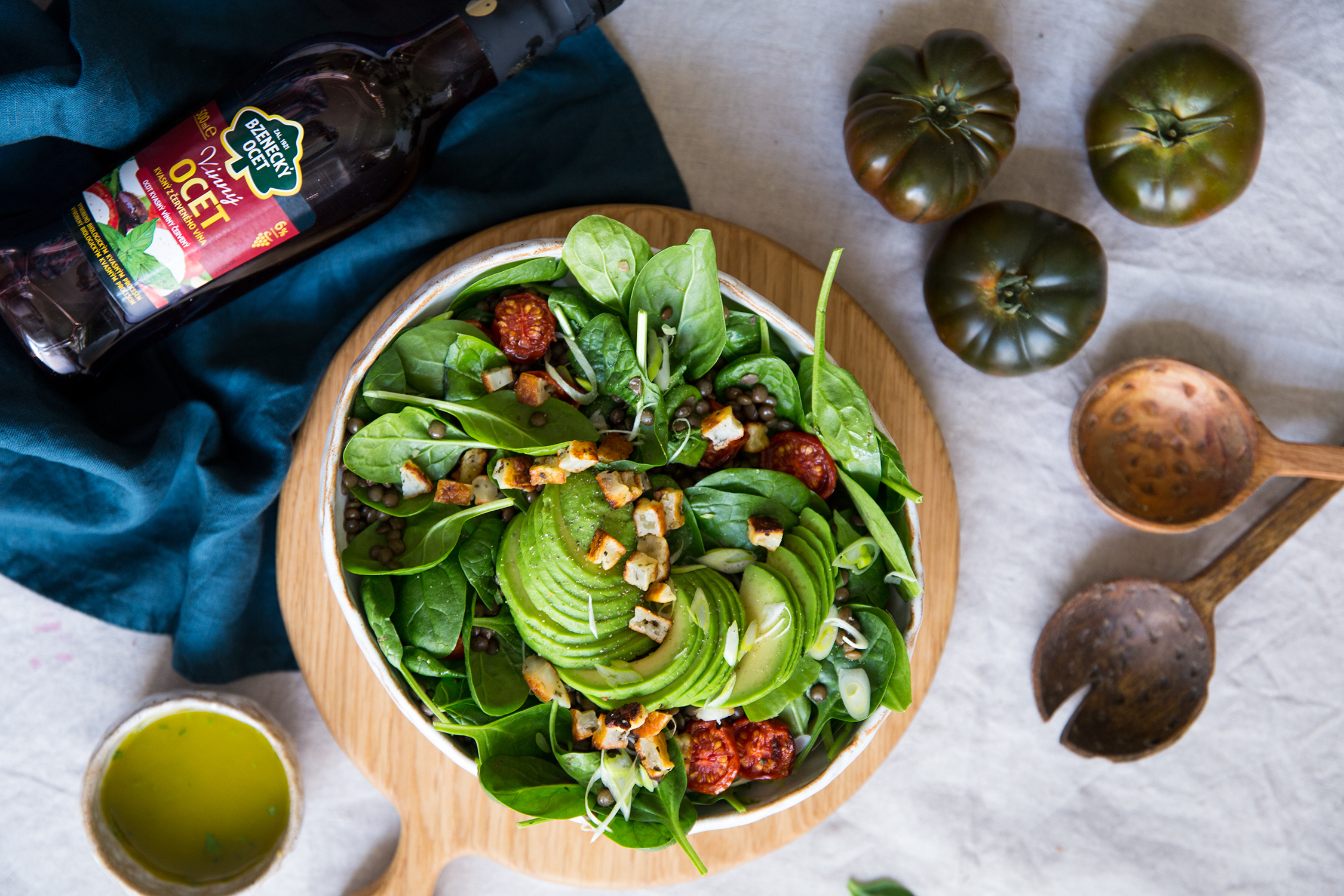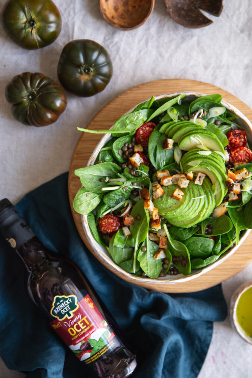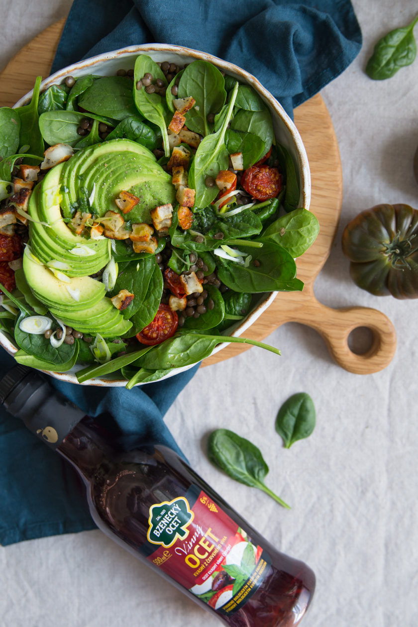 5. Na závěr ve středně velké míse smícháme 300g uvařené čočky, 100g špenátu, jarní cibulku, cherry rajčátka, avokádo a kostky halloumi. Přilijeme podle chuti dresink a případně dochutíme solí, pepřem či octem.