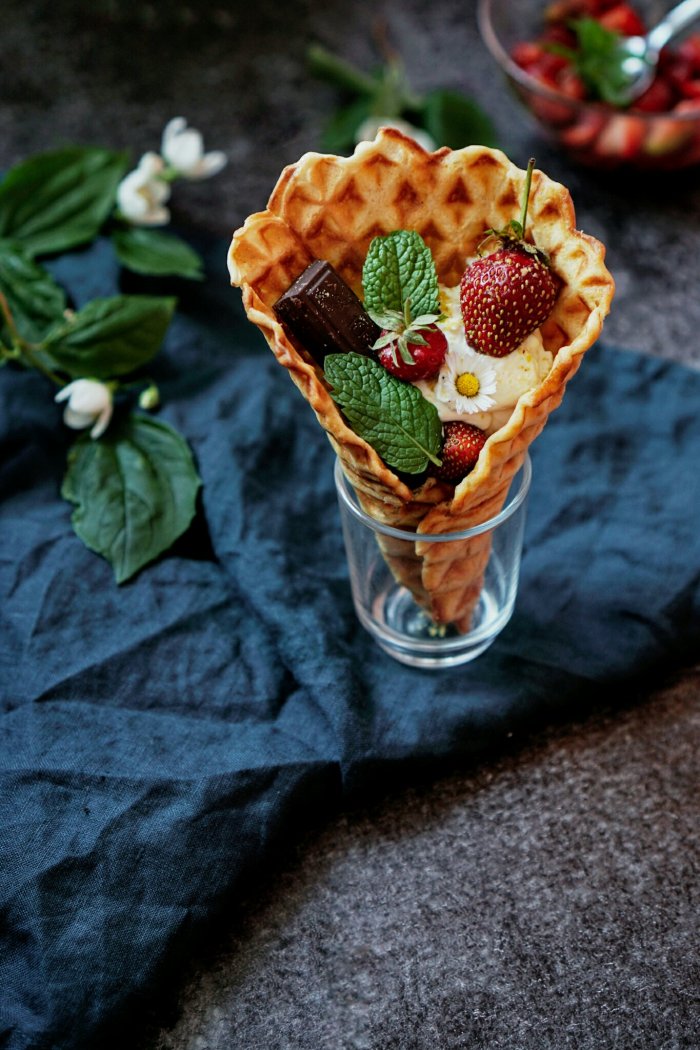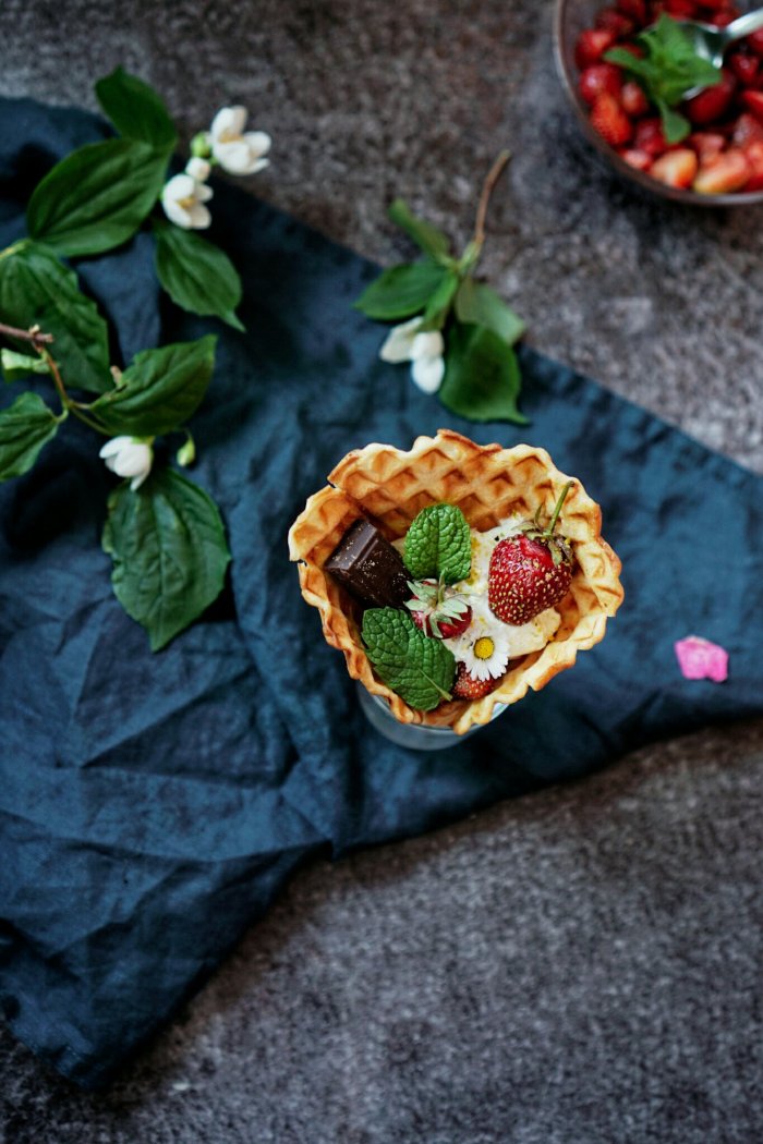 - Servírujte wafli s mascarpone nebo zakysanou smetanou, či ricottou, přelité jahodami a ozdobené čerstvým ovocem.
