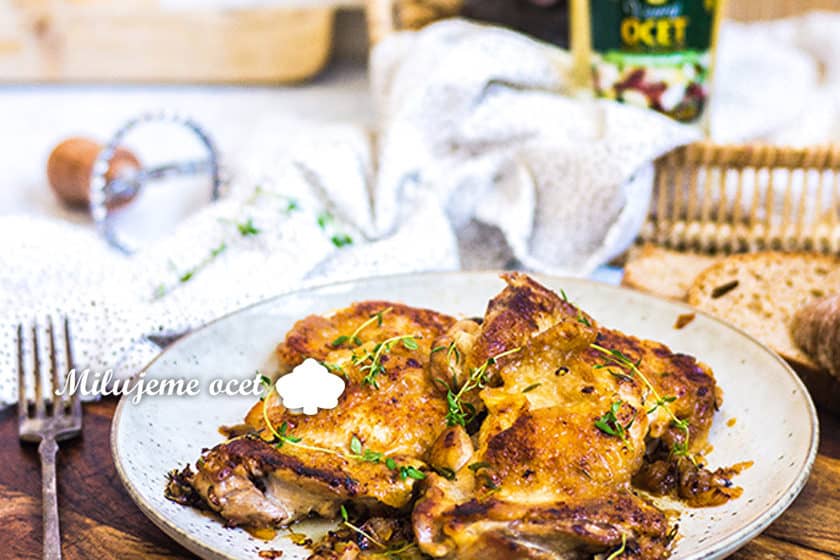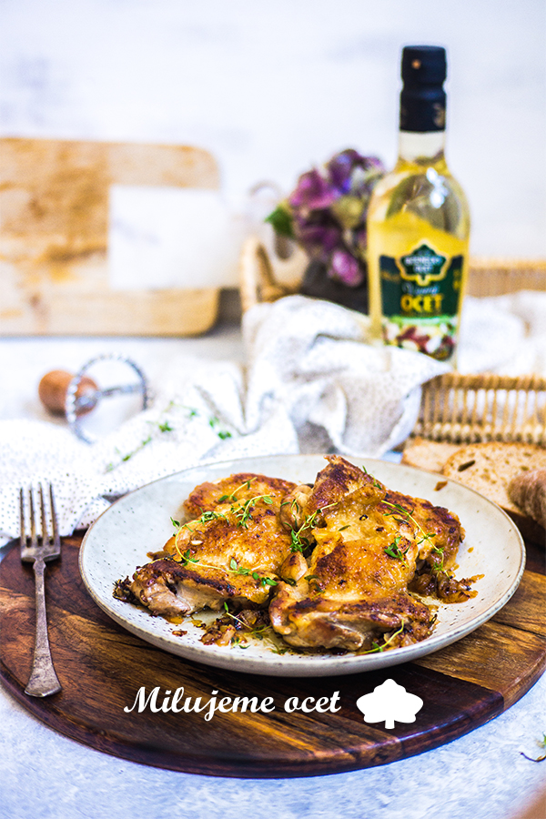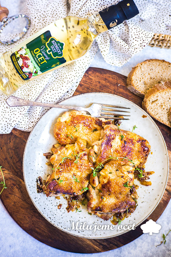 K cibuli vrátím zpět maso kůží nahoru a vše zaliju bílým vinným octem.