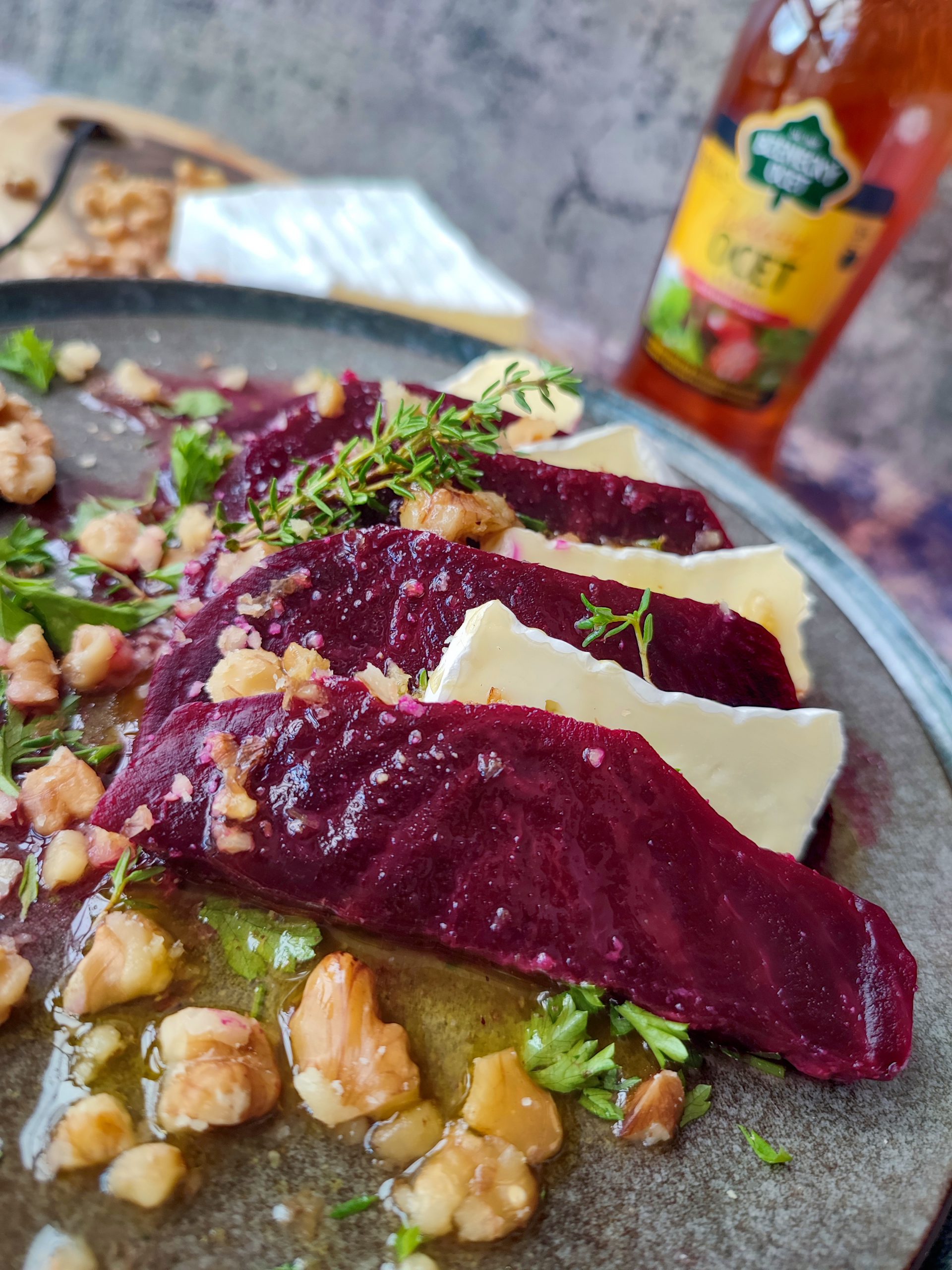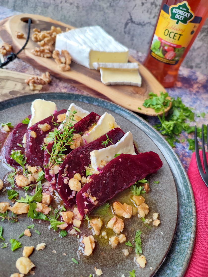 - Naskládejte plátky řepy na talíř a proložte je plátky sýra brie. Zasypejte nasekanými ořechy a ještě přelijte zbytkem marinády. Posypejte čerstvým tymiánem a petrželkou. Podávejte s křupavou bagetou nebo čerstvým kváskovým chlebem.