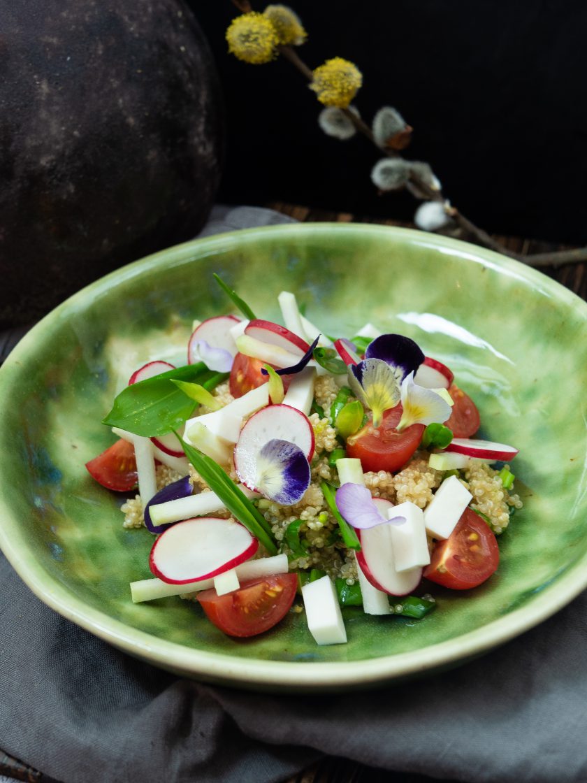 Jaro je tu a my už jsme najeli na čerstvou sezónní stravu. Mezi ty první vlaštovky patří ředkvičky a medvědí česnek: obojího se v tomhle období prostě nemůžeme přejíst. A aby salát nebyl jen samé listí, doplnili jsme ho ještě o bílou quinou.