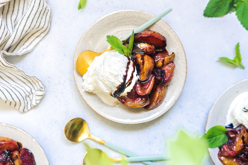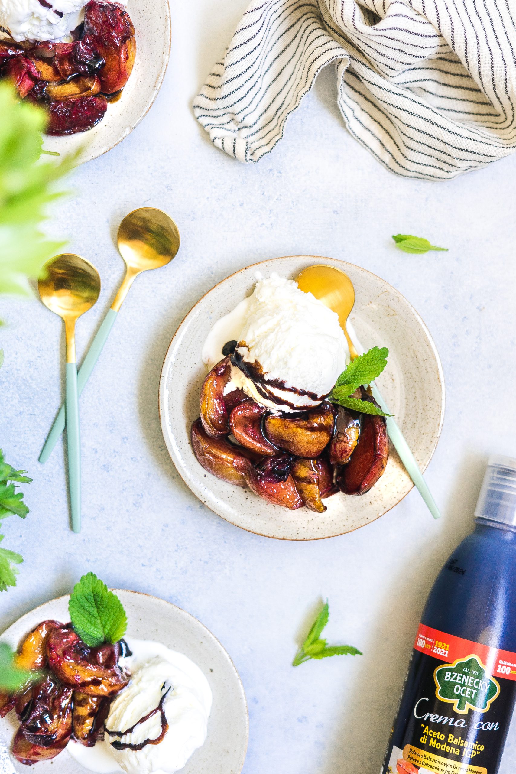 Zmrzlina s ovocem, to je klasika, kterou všichni známe z dětství v podobě různých zmrzlinových pohárů. Pokud ale chcete tuhle nostalgickou vzpomínku trochu povýšit, zkuste ovoce upéct s trochou cukru a balzamikovým octem nebo krémem. Ten se k ovoci skvěle hodí, při pečení sám zkaramelizuje a spolu s ovocnou šťávou vytvoří lehký sirup. Ovoce můžete se zmrzlinou servírovat ještě vlažné nebo nechat zcela vychladit. Použít můžete zrovna to, co je právě v sezóně, ale nejlepší jsou různé peckoviny a bobuloviny. Je to velmi variabilní recept, který bude vždycky jiný a vždycky vynikající. Doporučuju ovoce se zmrzlinou před servírováním zakápnout ještě trochou balzamikového krému, pak je to úplně nejvíc!