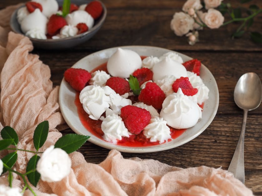 3. Rozvar nalijeme na dno talíře, naskládáme do něj pusinky. Některé můžeme nalámeme, některé necháme v celku – k nalámání se dobře dají využít nepodařené tvary. Vše dozdobíme šlehačkou a lístky máty.