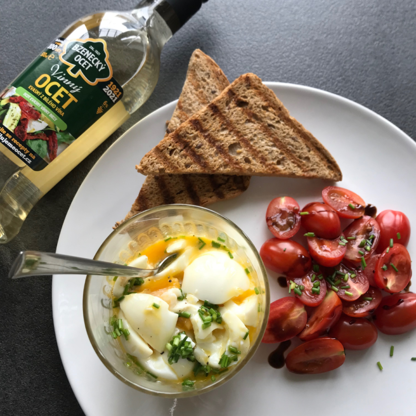 - Podáváme třeba s cherry rajčaty, zakáplými octem balsamico crema, a opečeným toustem.
