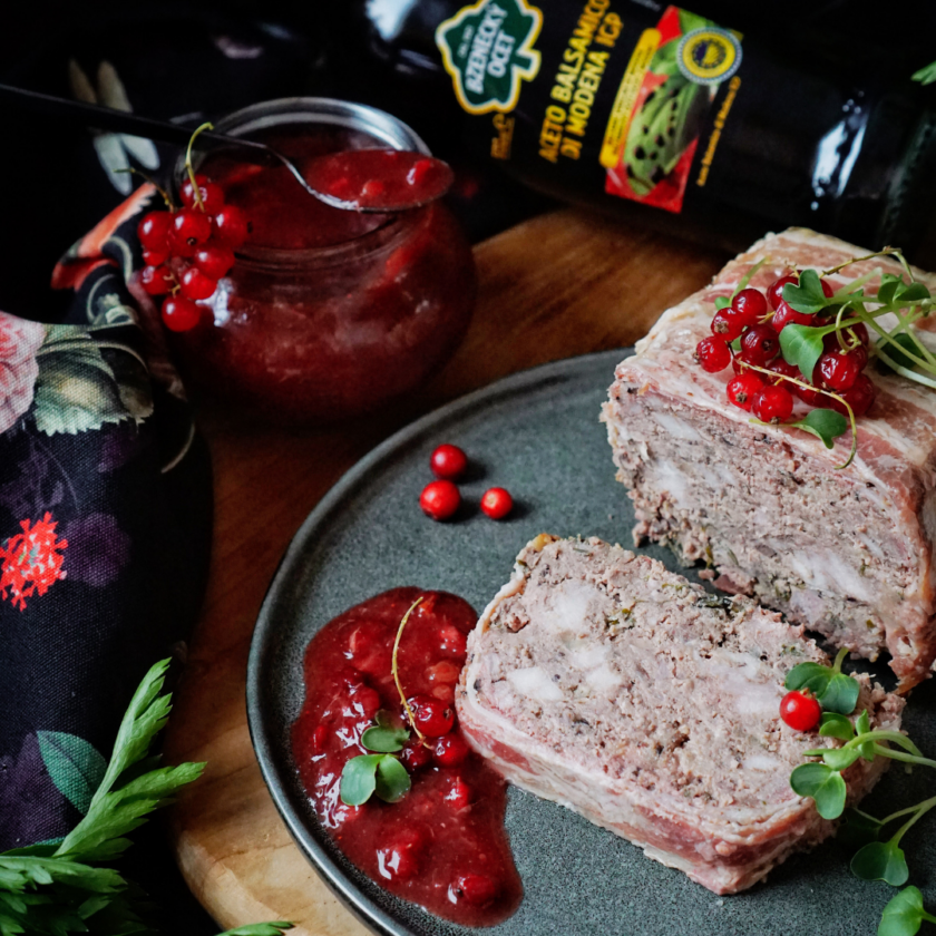- Takto připravenou terinu pečeme v předehřáté troubě na 180°C asi hodinu a půl. Hotovou ji můžete podávat i teplou, ale správně by se nejdříve měla nechat vychladit v ledničce. Studená se také lépe krájí. Podáváme společně s omáčkou cumberland.